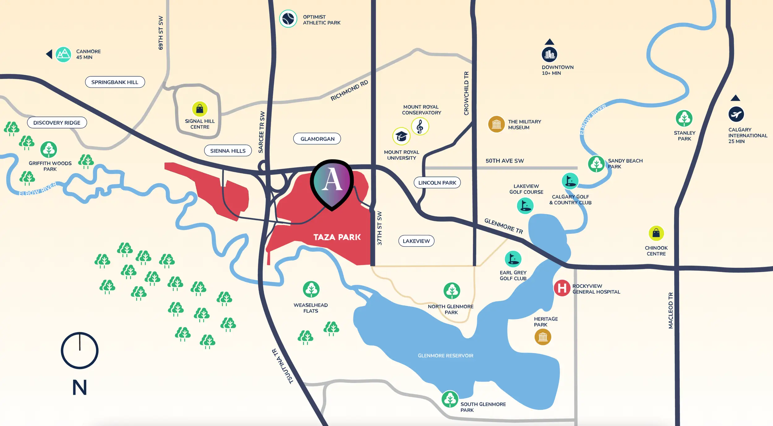 Located in SW Calgary adjacent to the Weaselhead Flats in North Glenmore Park, Aurora at Taza Park boasts a prime location just moments from Calgary's bustling downtown core with breathtaking Rocky Mountain views. Residents will enjoy quick and convenient access to Stoney Trail & Glenmore Trail SW for seamless travel throughout the city. Nearby amenities include Signal Hill Shopping Centre, Rockyview General Hospital, the expansive Weaselhead Flats Natural Environment Park, and the picturesque Glenmore Reservoir.
